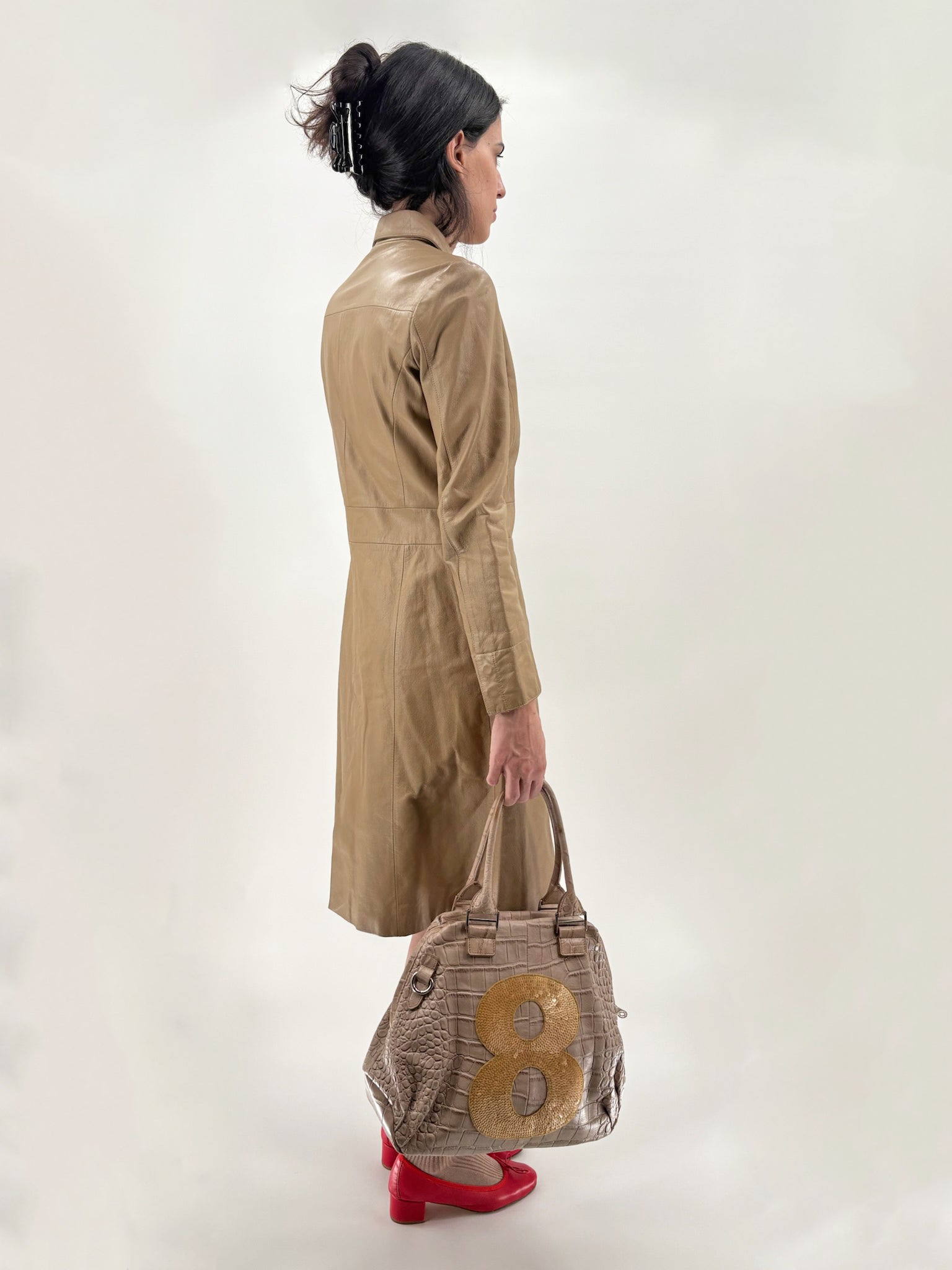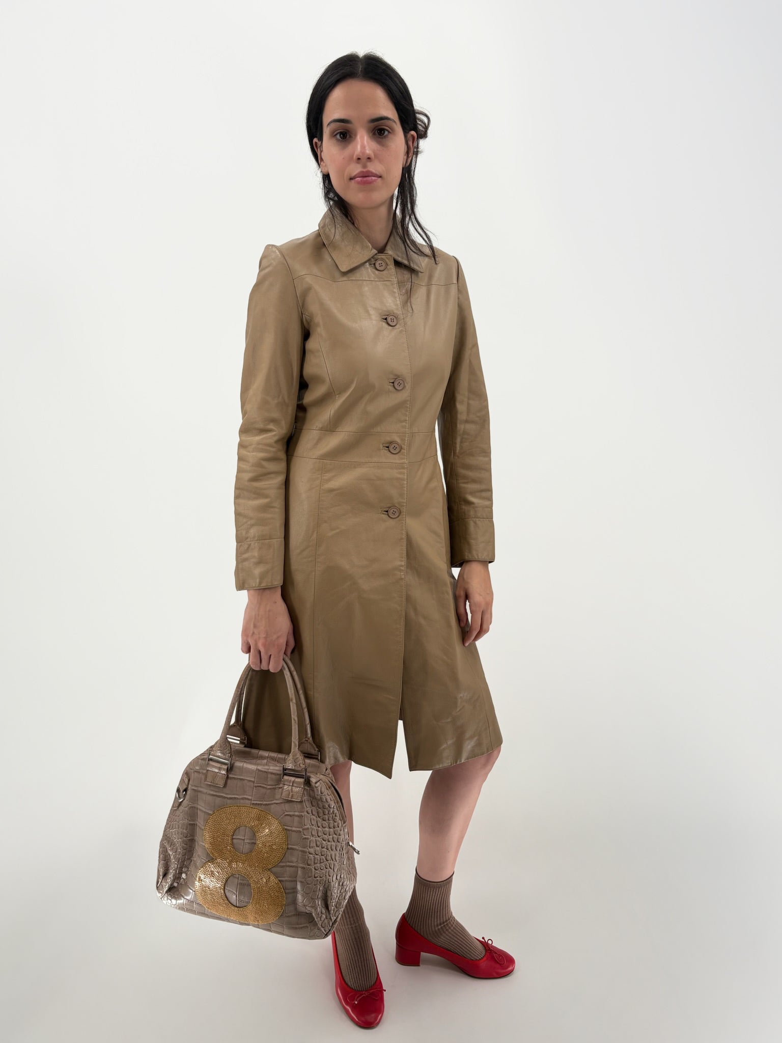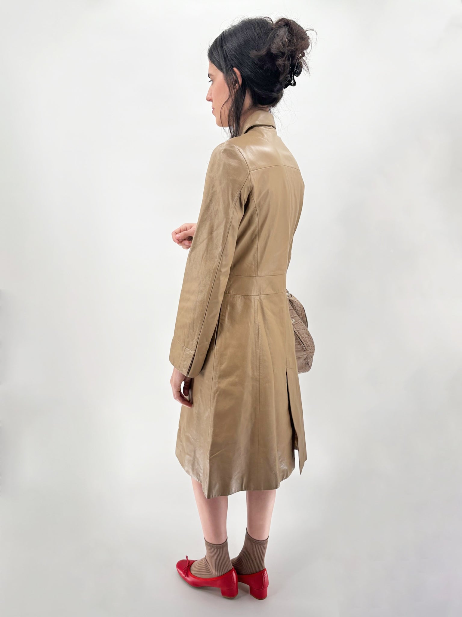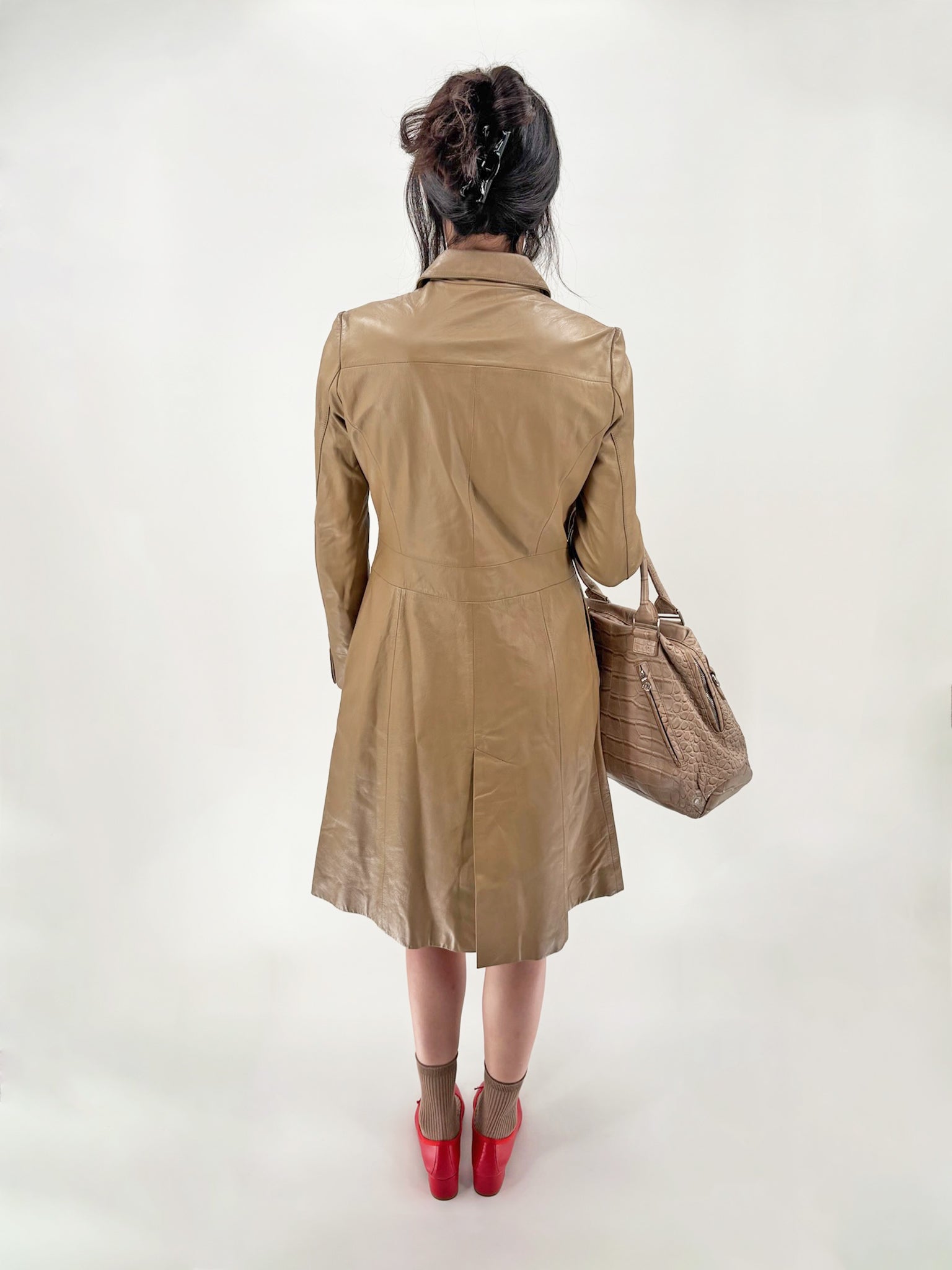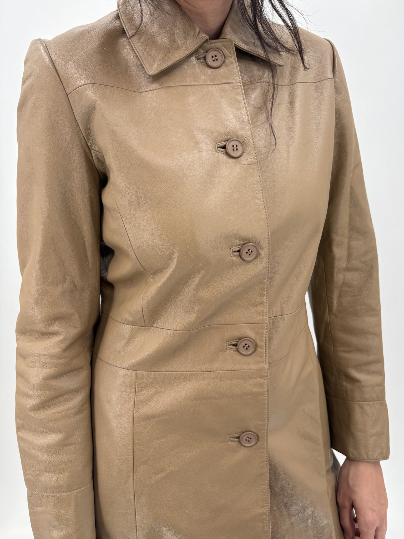 long leather coat with a slim, tailored fit, button down closure and collared neck